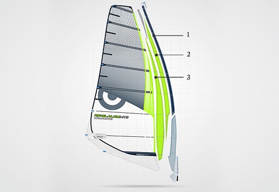 Différents matériaux ont été utilisés pour le fourreau de la MK6. Chacun d'eux dispose de propriétés spécifiques, l'objectif général étant d'optimiser la stabilité et l'élasticité de l'entrée du profil, Le tissu de la partie avant haute (1) est léger. Son élasticité et sa solidité lui permettent de résister à l'usure provenant du contact direct avec le mât. Le panneau qui suit est conçu avec le matériau ultra ArmourWeb (2) à faible étirement. Cette structure permet de supporter une tension d'amure élevée, caractéristique essentielle pour stabiliser l'entrée du profil et combler l'espace entre les Ultra Cams sans créer de plis. Entre le panneau ultra et le corps de la voile vient se blottir un tissu doublé film/taffetas très léger antidéchirement composé de fils ultra (3). Le film contrôle l'étirement, l'ultra offre une grande résistance à la déchirure et le taffetas permet de renforcer les coutures. La partie basse du fourreau dispose de notre revêtement Luff Glide, comme les autres voiles NeilPryde. Ce matériau assure un faible frottement contre le mât (important pour une rotation douce) et d'excellentes propriétés en matière de solidité et d'élasticité qui sont deux paramètres nécessaires en partie basse.